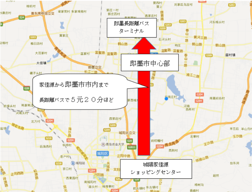 家佳源から即墨市市内中心部まで長距離バスで5元20分ほど。
