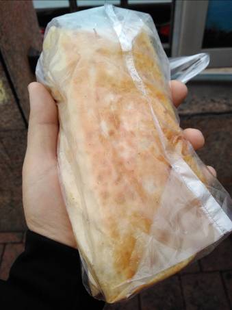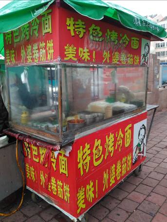 その他、向かいの「利津路客運駅」バス停のところには煎餅果子(4元~)、利津路と長春路の交差点には、外婆巻筋餅(5元)。