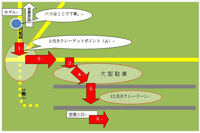休憩も済んだし、いよいよ空港へ。民航路を空港に向かってまっすぐ。〔ポイント1〕