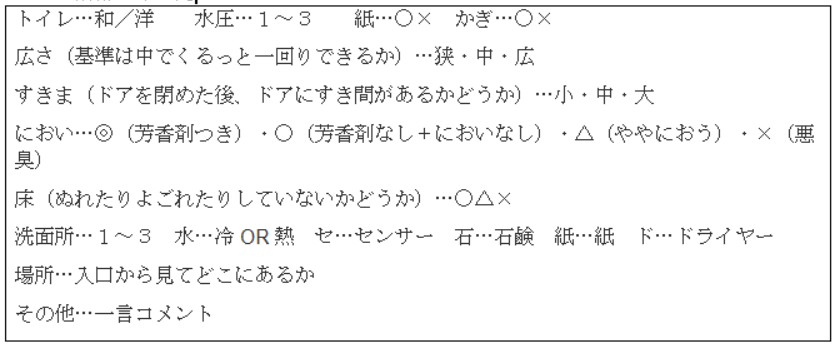 トイレ…和/洋 水圧…1~3 紙…○× かぎ…○× 広さ(基準は中でくるっと一回りできるか)…狭・中・広 すきま(ドアを閉めた後、ドアにすき間があるかどうか)…小・中・大 におい…◎(芳香剤つき)・○(芳香剤なし+においなし)・△(ややにおう)・×(悪臭) 床(ぬれたりよごれたりしていないかどうか)…○△× 洗面所…1~3 水…冷OR熱 セ…センサー 石…石鹸 紙…紙 ド…ドライヤー 場所…入口から見てどこにあるか その他…一言コメント |